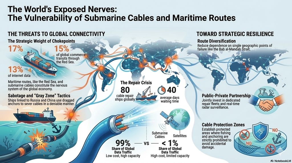 While global geopolitical attention often focuses on the flow of crude oil, a deeper realization emerges in 2026: the true backbone of the modern economy does not flow through oil tankers, but through the undersea cables that carry over 99% of intercontinental data traffic. If oil is the energy of the past, data is the black gold of the present, and the maritime chokepoints of the Middle East are its most vulnerable guardians.