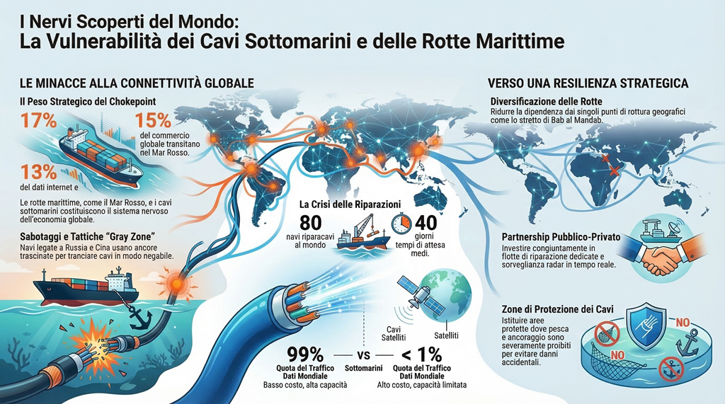 Mentre l’attenzione geopolitica globale si concentra spesso sul flusso di greggio, nel 2026 emerge una consapevolezza più profonda: la vera spina dorsale dell’economia moderna non scorre nelle petroliere, ma nei cavi sottomarini che trasportano oltre il 99% del traffico dati intercontinentale. Se il petrolio è l’energia del passato, i dati sono l’oro nero del presente, e i colli di bottiglia marittimi del Medio Oriente ne sono i guardiani più fragili.
